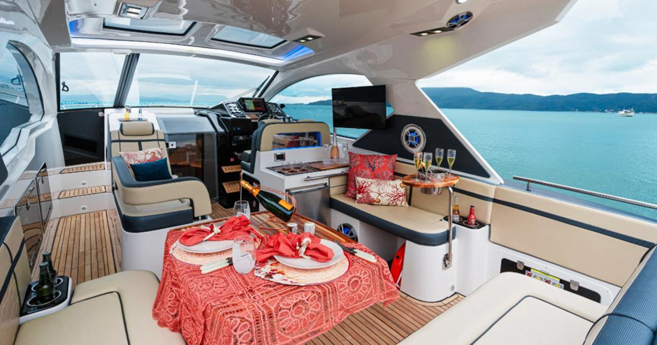 A Focker 300 Gran Turismo, tem um design impressionante e tecnologia avançada, proporcionando uma experiência de navegação luxuosa.