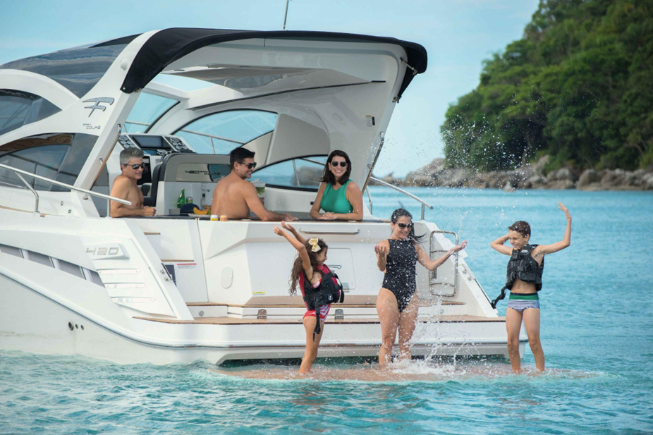 Quando pensamos em diversão em família, precisamos levar em consideração ambientes pensados para crianças e adolescentes. Lanchas como a F420 Gran Coupé são ideais para famílias com crianças pequenas, pois possui uma plataforma de popa submergível, garantindo a diversão dos pequenos com muita segurança.
