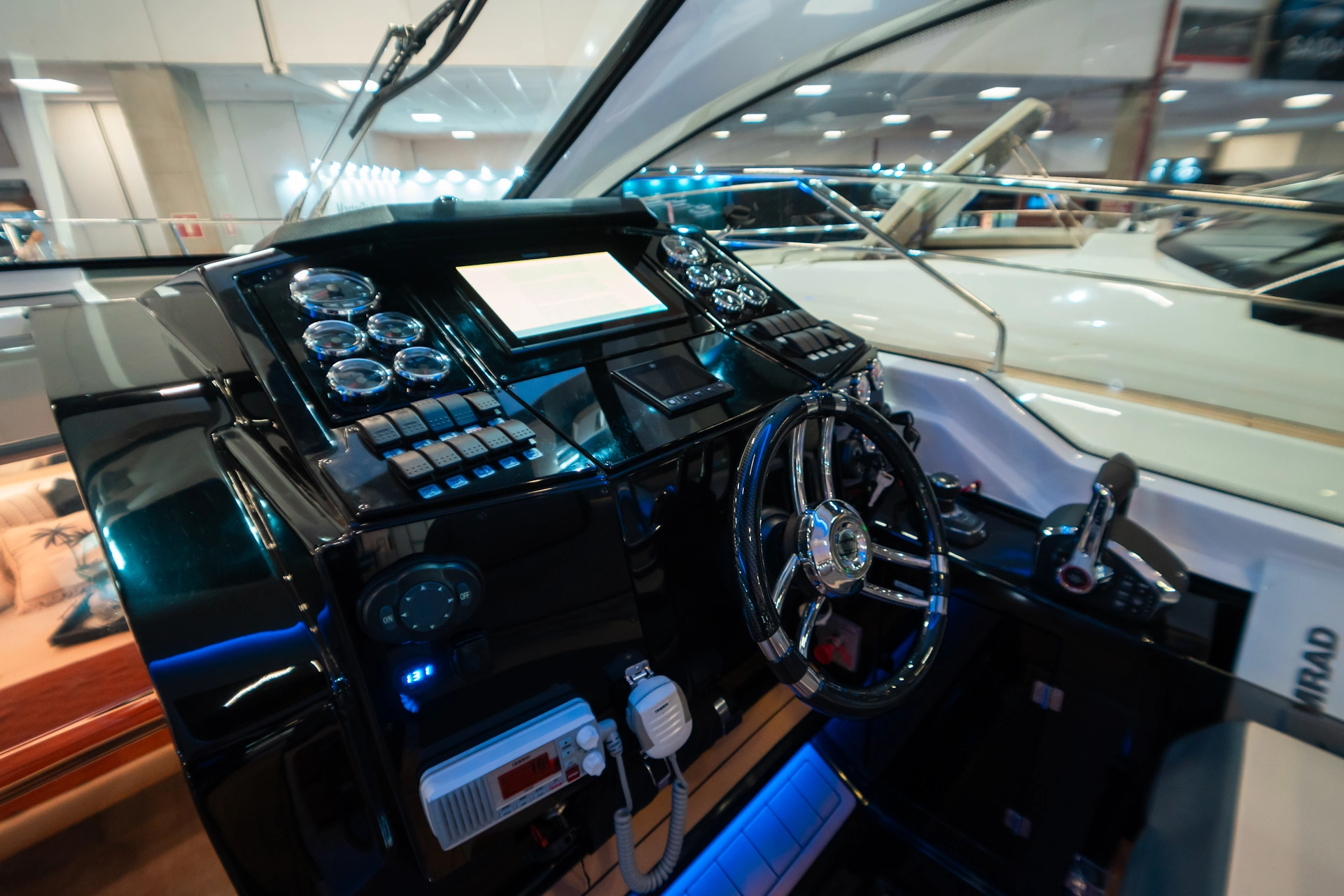 COCKPIT • Banco piloto duplo rebatível; • Suporte rebatível para pilotagem em pé; • Teclas: • Buzina; • Blower; • Bomba de água doce; • Luz ancoragem; • Luz navegação; • Luz hard top; • Luz do porão; • Iluminação de proa; • Voltímetro com Tomada USB; • Volante italiano; • Acionador do extintor do porão; • Bússola; • Porta da cabine; • Painel de comando; • Chaise com encosto lateral; • Balcão com tampo e geleira com acabamentos em teka; • Pega mão distribuidos pelo convés; • Capa entrada de ar; • Adesivo 3D de identificação; • Assentos do convés com paiol, caixa térmica e disposição para bóia; • Luzes de cortesia; • Lixeira acrílico - 24L; • Mesa em teka com rebaixamento; • Armários para coletes; • Porta copos inox com led com acabamento em acrílico; • Caixa do sistema elétrico com 2 chaves gerais e tomada de cais.