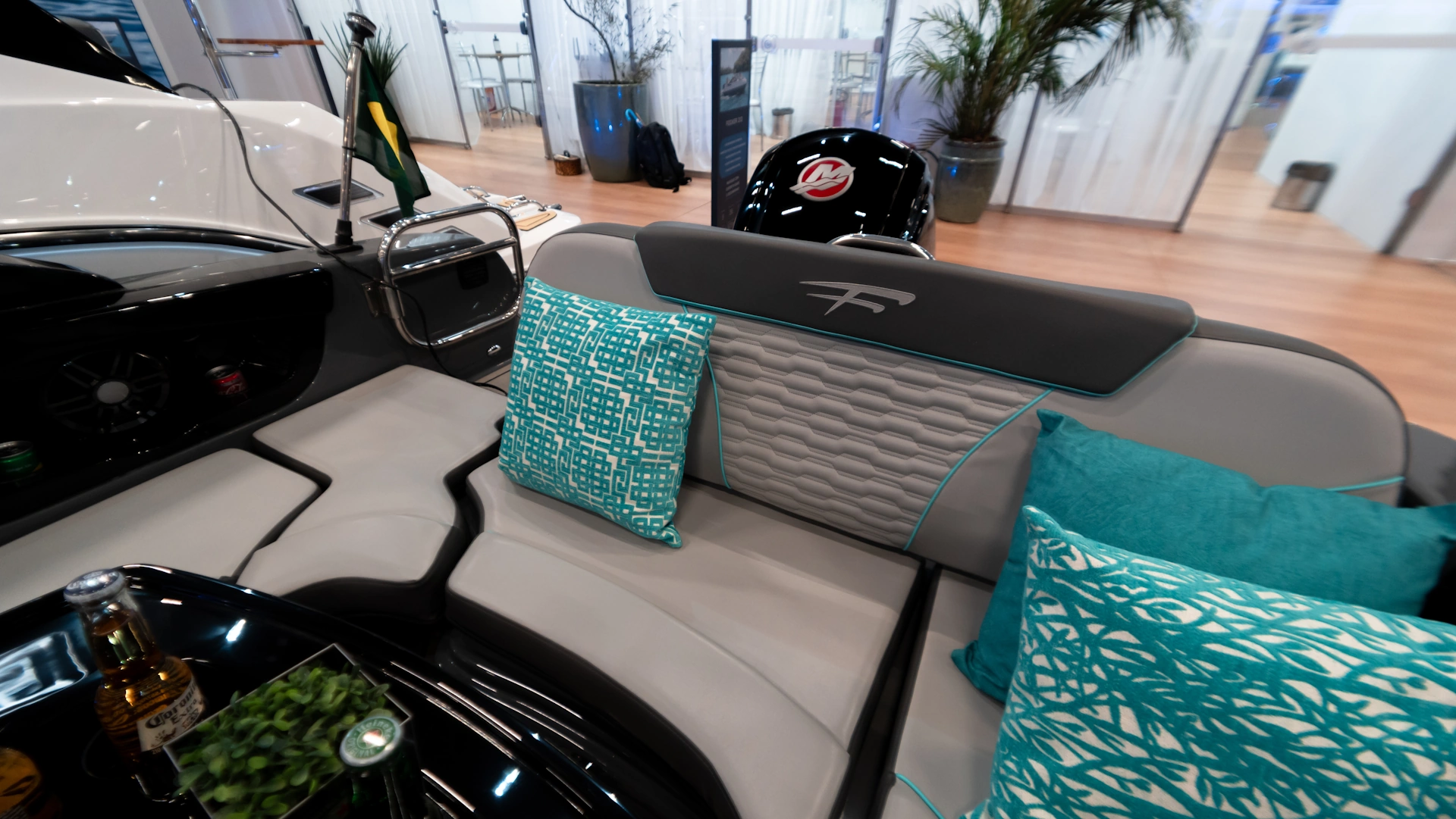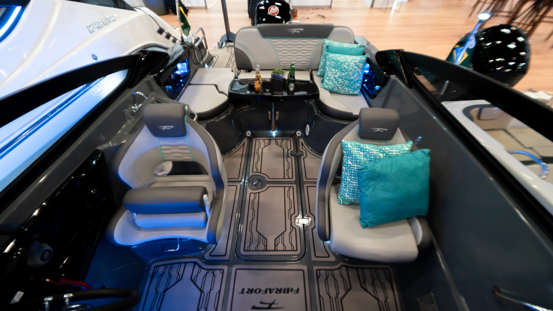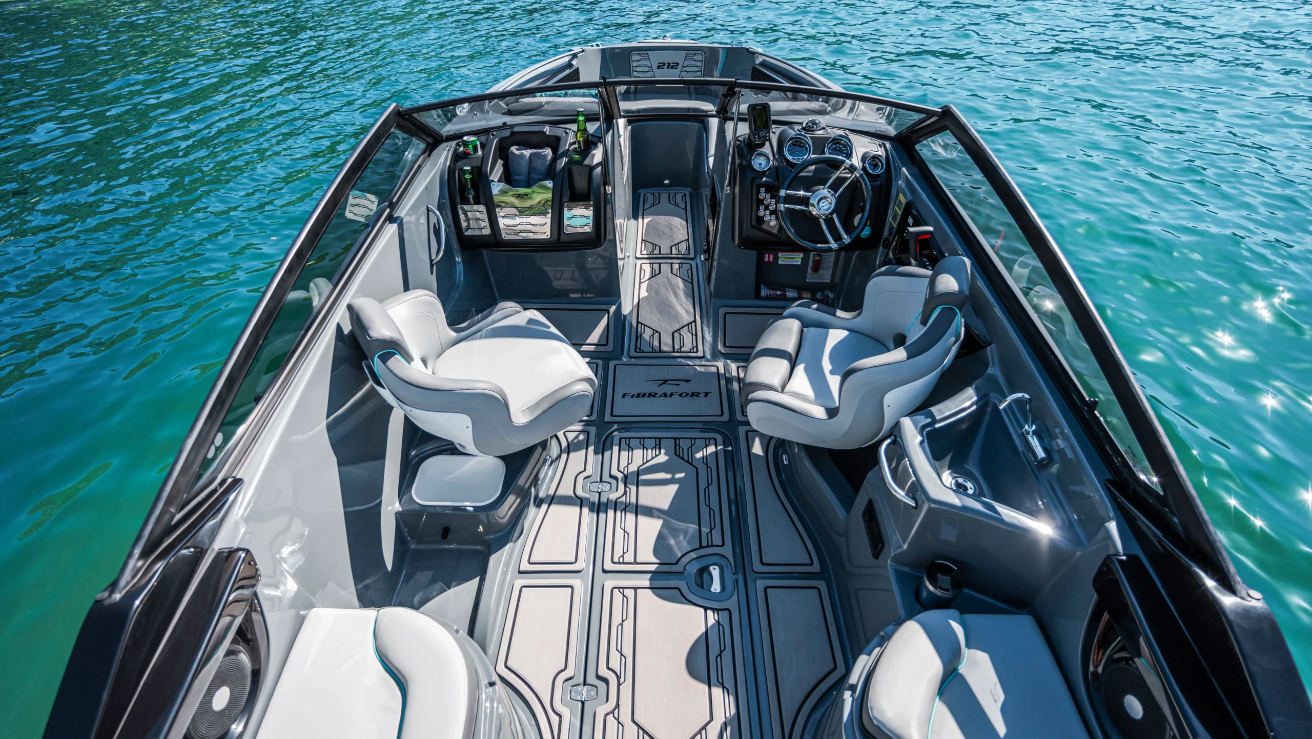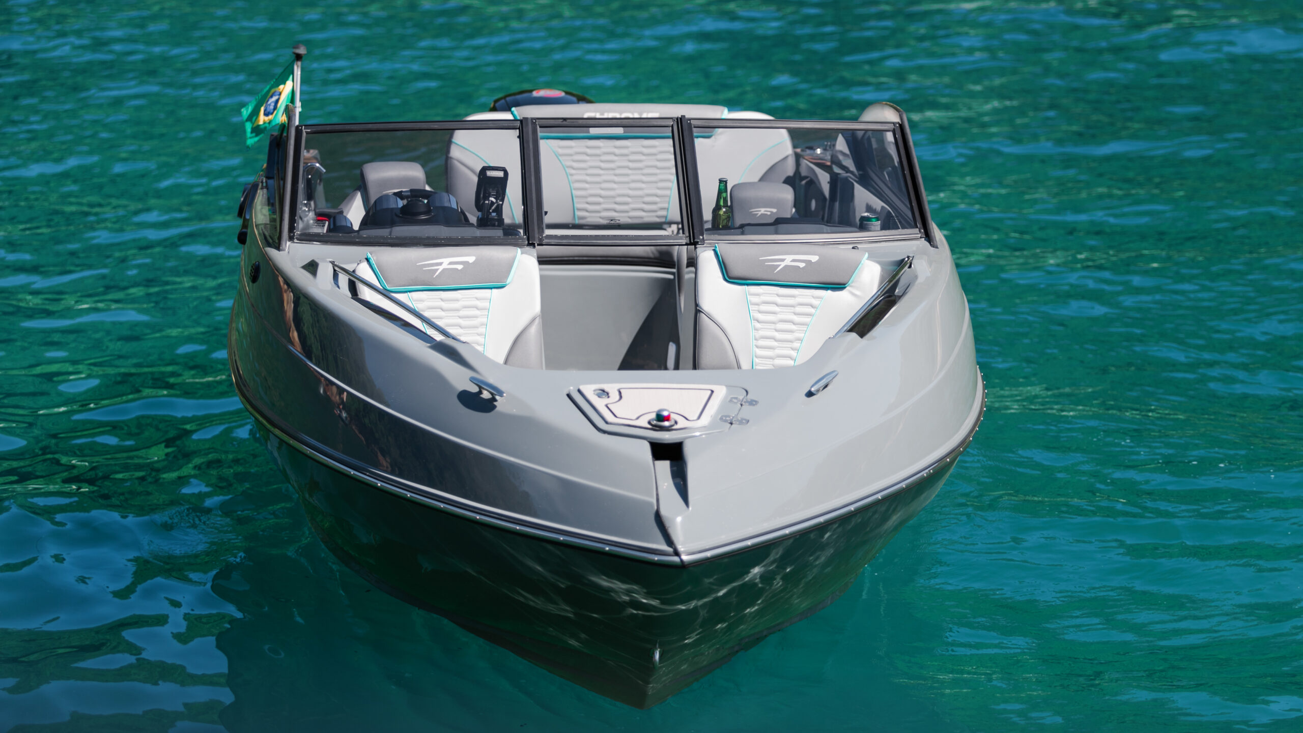 • Encaixe para Roller;• Luz de navegação; • Tampa da caixa de âncora; • Cunhos 6”; • Guarda mancebo baixo em inox com borracha de suporte e apoio direto na fibra; • Encaixe para solário de proa; • Console de som com porta copos e iluminação indireta; • Escoamento de água; • Portinhola no parabrisas de passagem para proa; • Console de som com disposição alto falante 6,5”, 2 porta copos de borracha raso, almofada de acabamento, 2x acabamento fusion e iluminação indireta 2x azul – 2