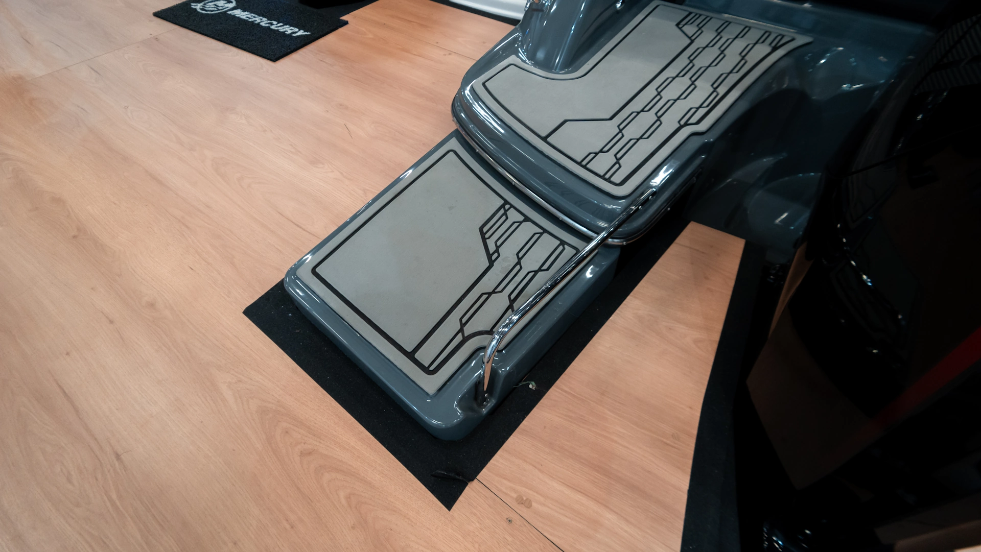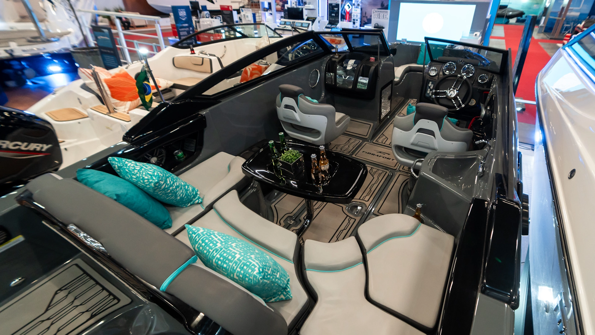 • Placa identificação CE; • Banco co-piloto sport; • Console copiloto com porta objetos e iluminação indireta;• Porta copos no console; • Chapa de inóx comunicação visual no console com detalhe fusion; • Pega mão distribuidos pelo convés; • Capa lateral nova com identificação comunicação visual; • Circulação de ar; • Adesivo de identificação comunicação visual; • Console de som com porta copos e iluminação indireta – dois na proa e dois na popa; • Lixeira de plástico com convite; • Sistema elétrico chave geral; • Convite para caixa térmica no próprio convés; • Caixas porta objetos sob assentos; • Disposição para receber porta chuveirinho com chuveirinho; • Caixa térmica; • Torneira dobrável;