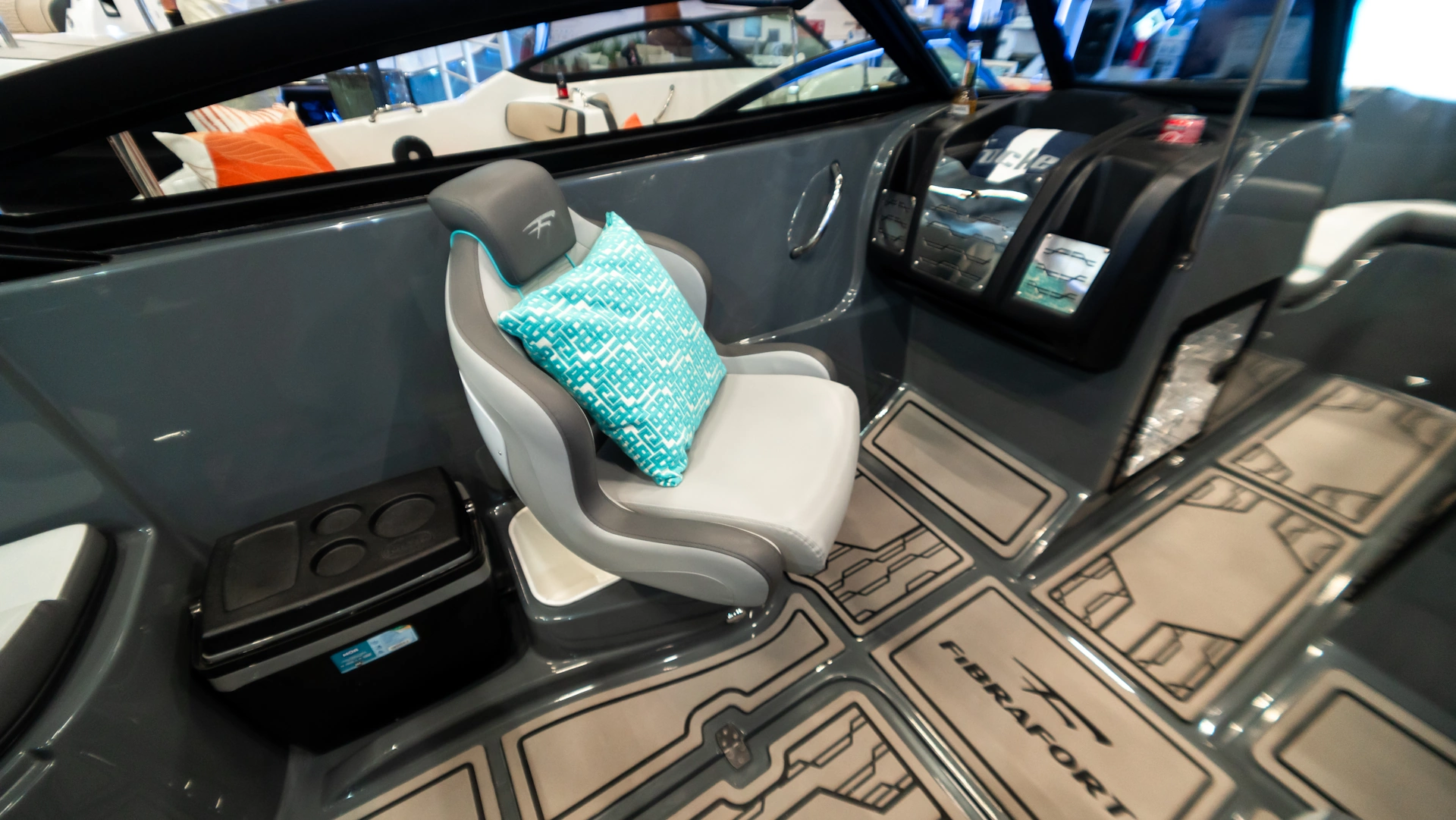 • Banco piloto modelo sport rebatível e regulável; • Console porta comando; • Suporte extintor na fibra do convés; • Relógio – Nível Combustível; • Volante; • Local para chave de ignição; • Voltimetro com Tomada USB;