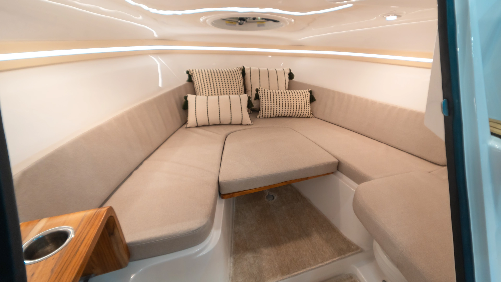 A Focker 242 GTC oferece conforto e bem-estar. Sua cabine sofisticada tem banheiro, revestimento requintado, armário em madeira teca e suporte para coletes. O cockpit e a plataforma permitem melhor interação entre os passageiros.